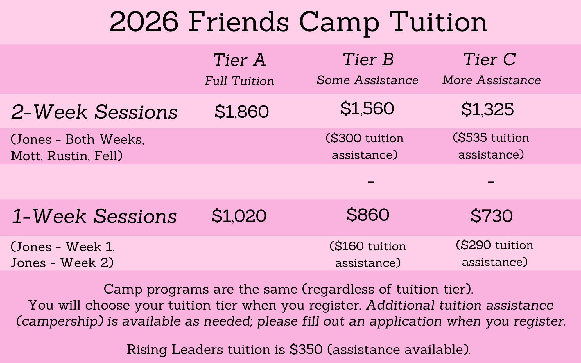 We value affordability and strive to keep the cost of camp low to families, while still operating a high-quality program. Friends Camp has a voluntary, three-tiered pricing structure that lets you pick the price you will pay for camp — without any difference in program experience. This is our way of making Friends Camp accessible to as many families as possible. Tuition assistance through tier B and tier C (see below), subsidized in part by annual fundraising, helps make camp more affordable for families who cannot afford the full price of camp. We also offer additional campership funds based on need, up to the total cost of camp. Click here to learn more about camperships at Friends Camp. It is our goal to make camp as accessible as possible to campers and families who want to attend Friends Camp.