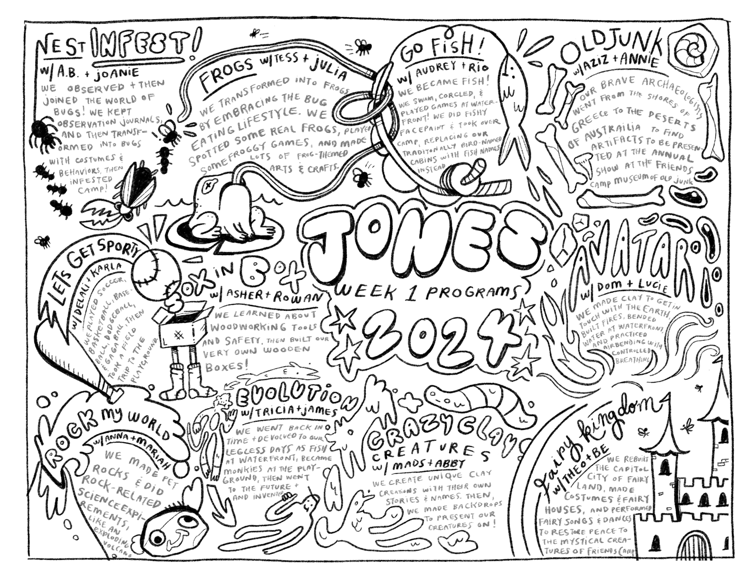 We offer a wide variety of morning programs each week. Programs last for three days, for around two hours per day. Our programs are created and run by counselors and are different every week, but we always make sure to offer a balance of active, creative, chill, and silly programs. Some programs teach campers new skills like pottery, sailing, or woodworking; others engage campers’ imaginations as they create characters, art, and stories. Programs are designed with camper age ranges in mind, so a Jones program (age 7-12) might look different from a Rustin/Fell program (age 13-17). See the examples of program recaps from sessions in past years below for a sense of the variety of program possibilities.
